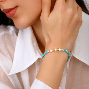 Bu el yapımı ayarlanabilir bileklik, güzel doğal görünümlü mavi howlit boncuklar, üç tatlı su incisi ve yüksek kaliteli metal detaylara sahiptir. Dayanıklılık ve stil düşünülerek tasarlanan bileklik, kırılmayacak güçlü bir çelik tel ve her bilek ölçüsüne uyacak şekilde ayarlanabilen sürgülü bir tokaya sahiptir.