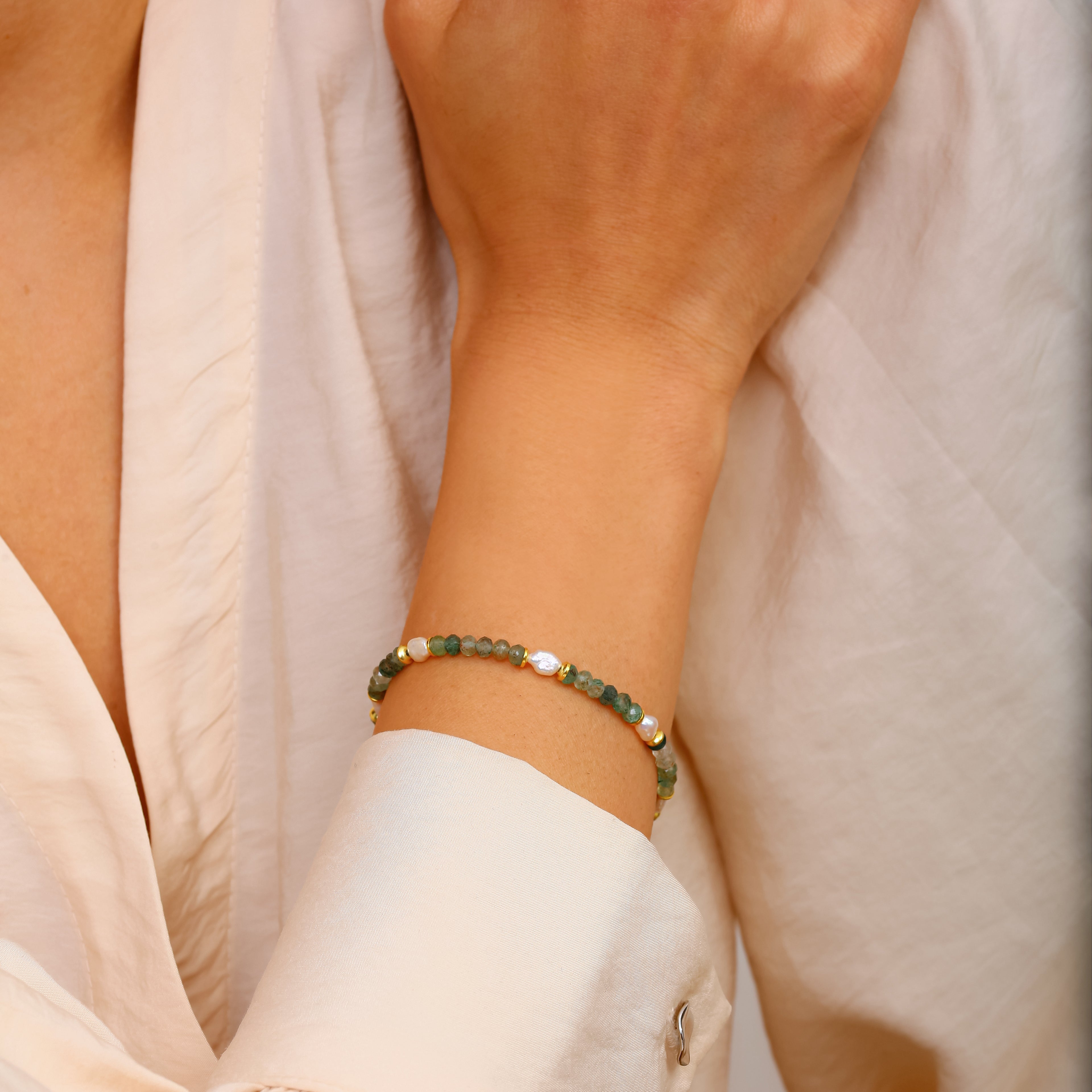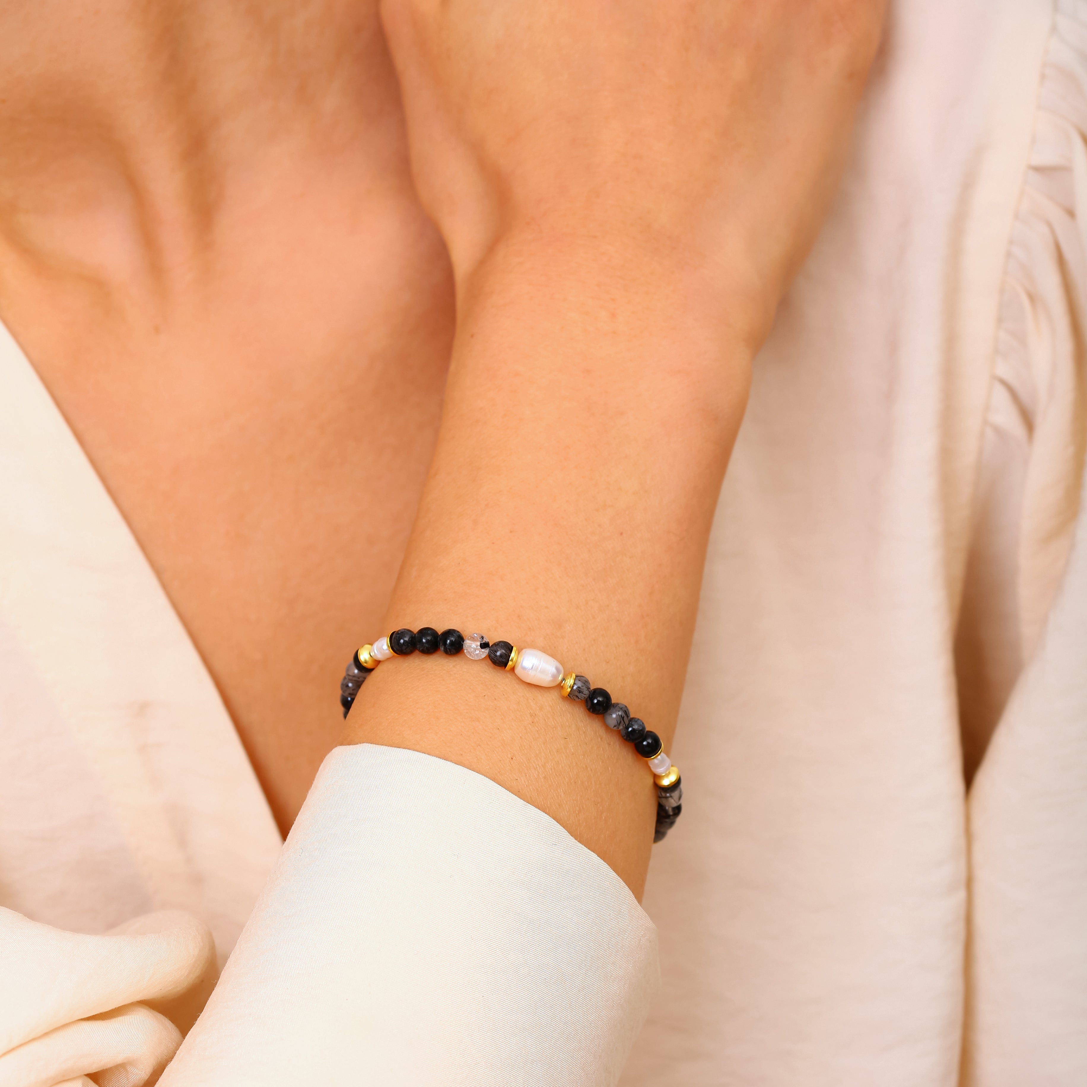 Turmalinli Kuvars ve İnci Detaylı Gümüş Bileklik - 18K Gold Vermeil Klipsli Tasarım