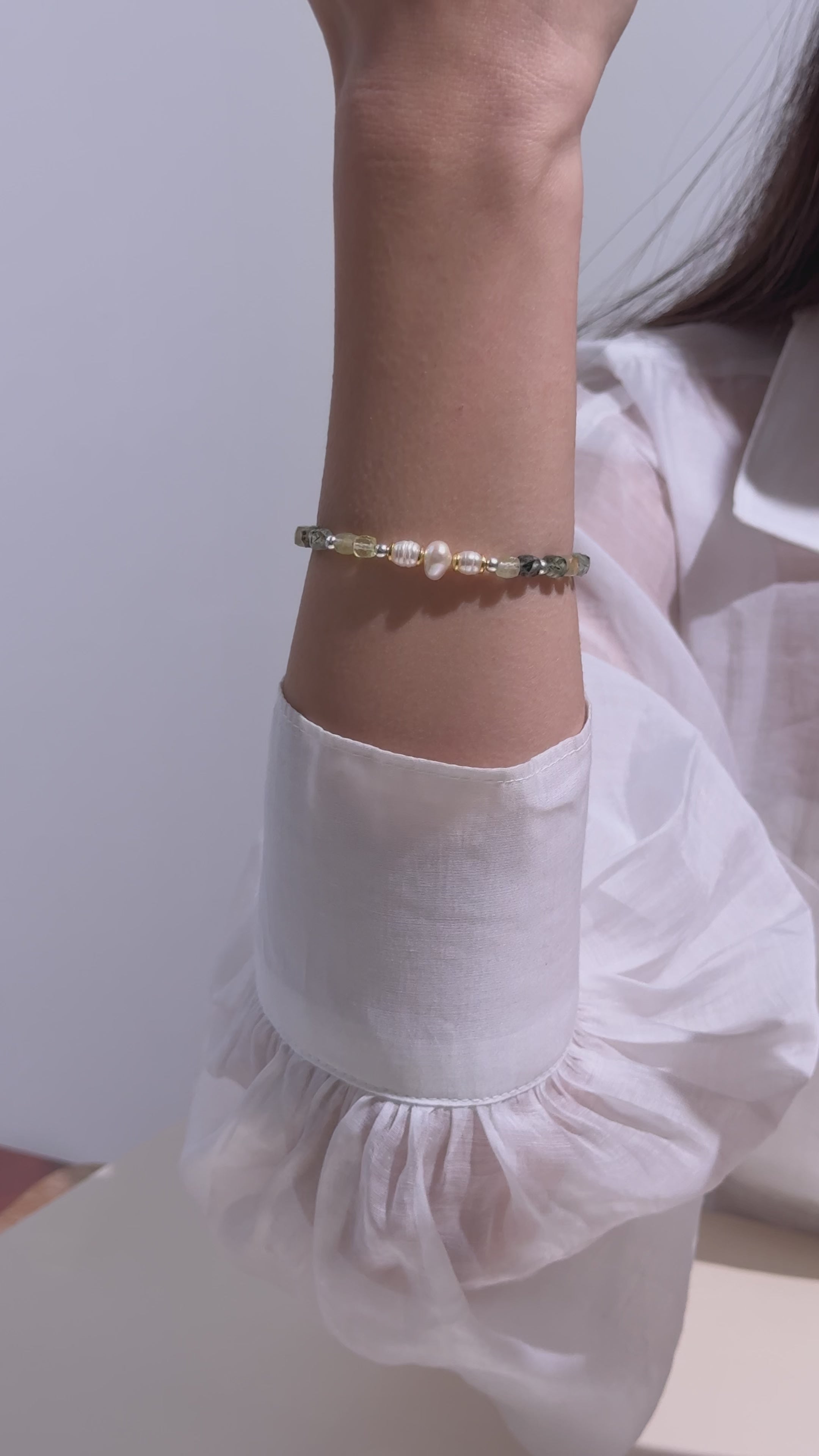 Bu zarif bileklik, doğal Prehnit taşları ve narin tatlı su incileriyle el yapımıdır. 🌿 Taşlar, uzun ömürlü dayanıklılık ve sağlamlık sağlayan dayanıklı, kırılmaya karşı dirençli çelik tel üzerine dizilmiştir. Ayarlanabilir tokası her bilek ölçüsüne mükemmel uyum sağlar. 🔒